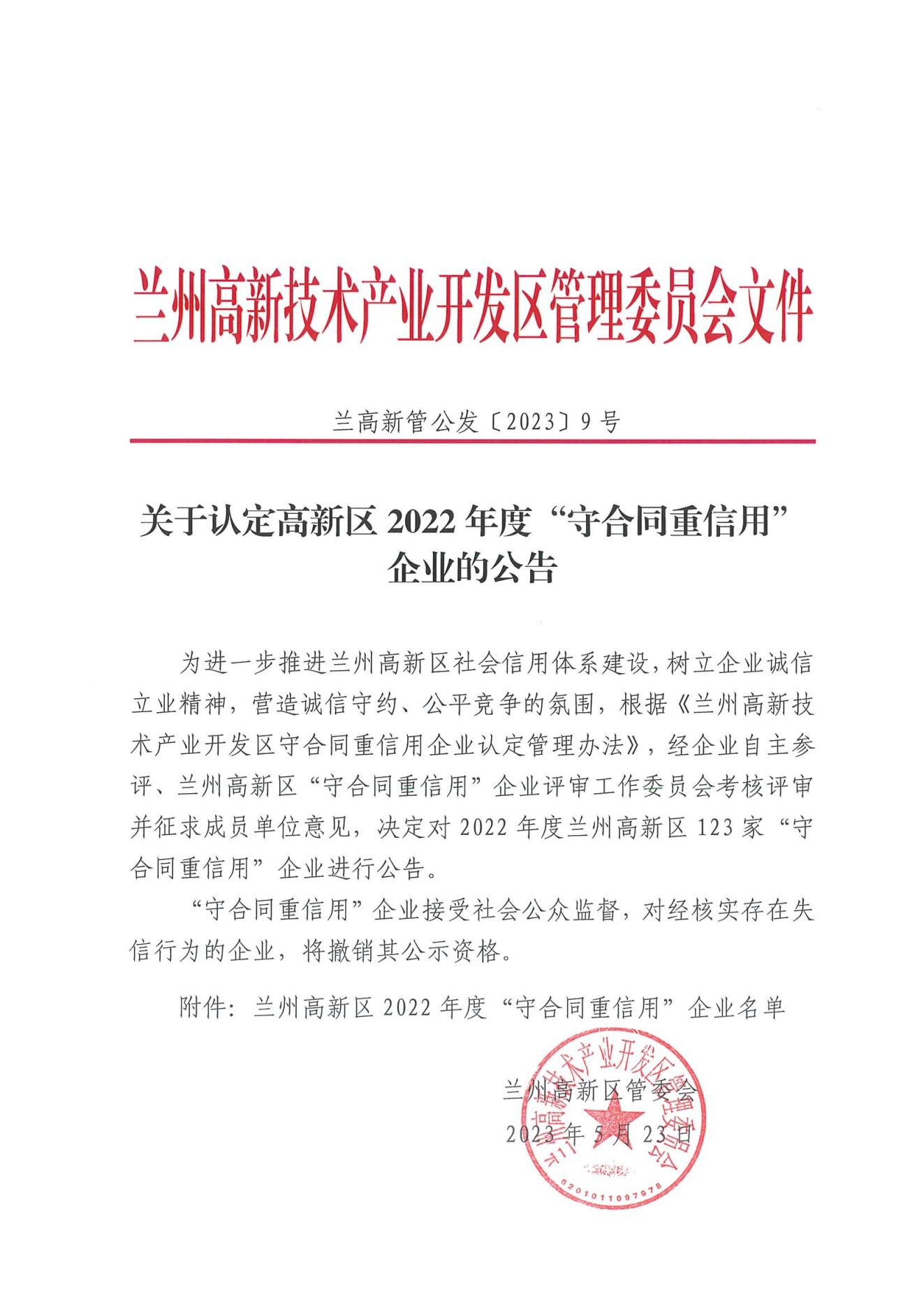 祝賀我公司首次榮獲蘭州高新區“守合同重信用企業”稱號